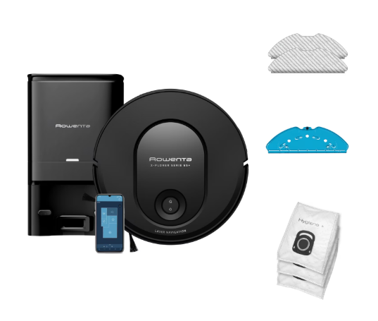 Aspirator robot Rowenta X-Plorer Serie 65+ RR8L85WH, aspirator si mop, 168 min, 2600 mAh, recipient praf 0.4L, recipient apa 300 ml, statie de incarcare si golire praf, mop Smart Aqua Power, negru