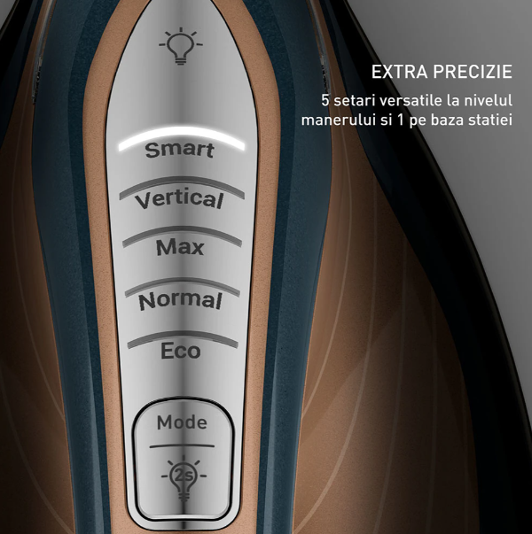 | Functii / Optiuni | Gaseste solutia perfecta pentru orice provocare de ingrijire a hainelor, cu ajutorul celor 5 setari versatile disponibile direct pe maner si una pe baza statiei de calcat; Functia inteligenta Smart Steam genereaza automat abur atunci cand fierul este in miscare si se va opri odata cu fierul |