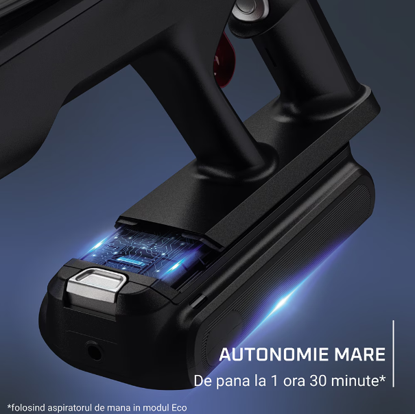 Maxim 1 ora 30 minute* de putere mare de aspirare cu o singura incarcare pentru curatare neintrerupta a locuintei tale. *folosind aspiratorul de mana in modul Eco